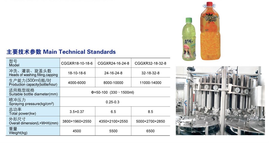 本設備適用于大瓶口和小瓶口PET瓶灌裝,含果肉飲料進行二次灌裝完成,集沖瓶、果肉灌裝、果汁 灌裝、旋蓋于一體,果肉灌裝均勻,產(chǎn)5000-30000瓶/時由用戶自選,是當今最理想的果肉飲料灌裝設備